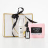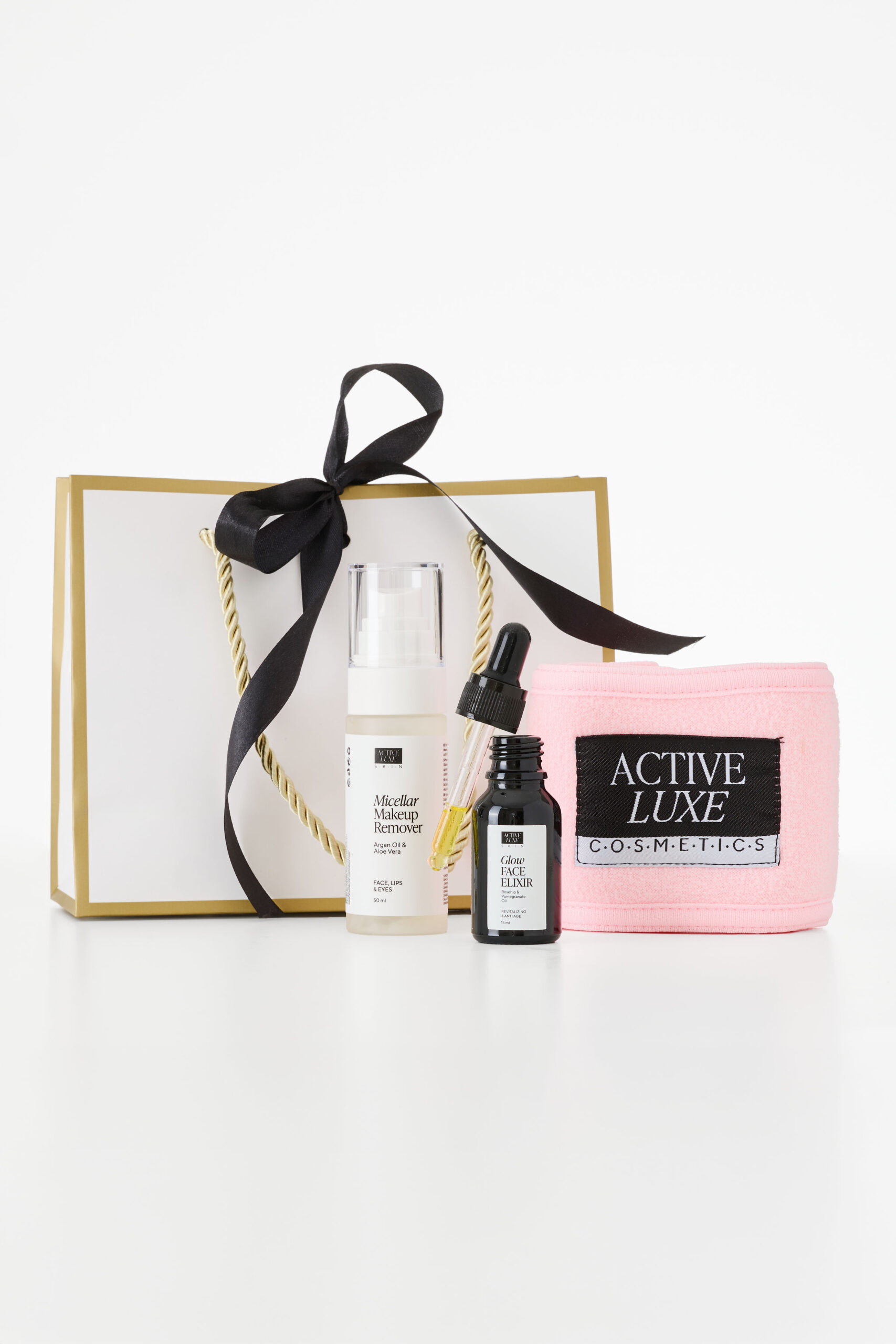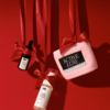Valentinov set Glow Face Care vsebuje micelarni odstranjevalec ličil, eliksir za sijočo in mladostno kožo ter mehak trak za lase.