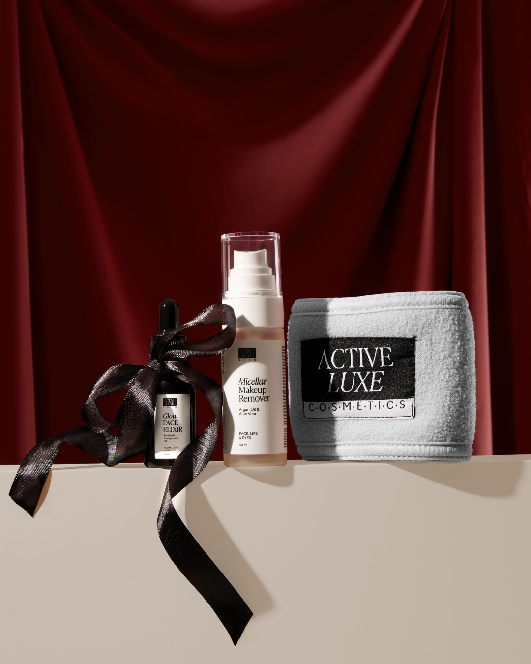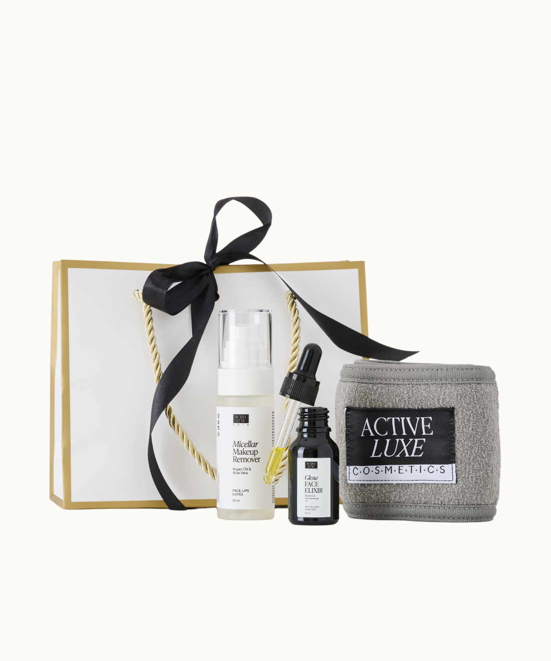 Darilni set GLOW FACE CARE vsebuje micelarni odstranjevalec ličil, eliksir za sijočo in mladostno kožo ter mehak trak za lase – popoln mini ritual za vsak dan.