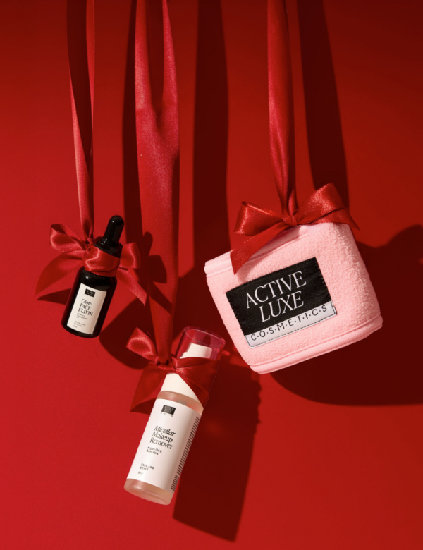 Valentinov set Glow Face Care vsebuje micelarni odstranjevalec ličil, eliksir za sijočo in mladostno kožo ter mehak trak za lase.